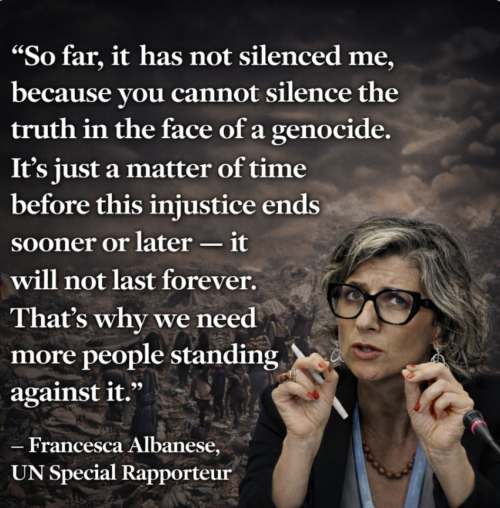Albanese’s documentation of Israel’s genocide in Gaza prompted the US to retaliate last summer by issuing sanctions against her forbidding her from entering the US, where she has a daughter. Additionally the sanctions bar her from obtaining a credit card or having a bank account. Albanese admits the sanctions have made her life difficult, but courageously responds, “They got the wrong person.”